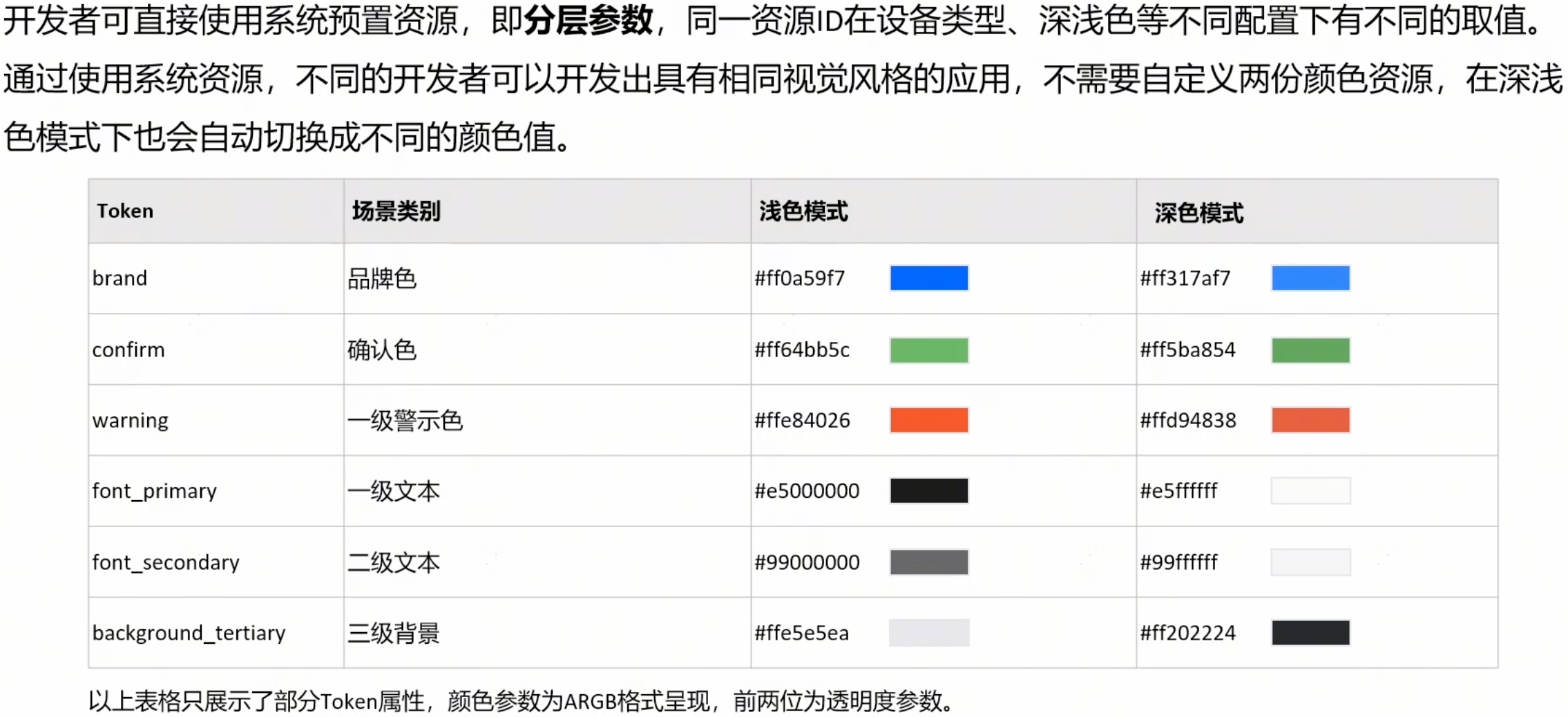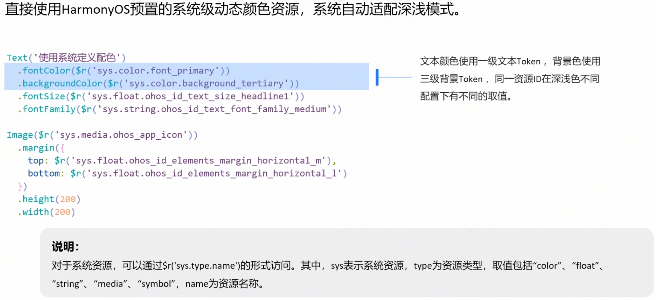 - 方式一:使用系统资源(优先建议)。使用受支持的系统资源会自动适配深色模式,开发者可查看系统资源获取受支持的系统资源。