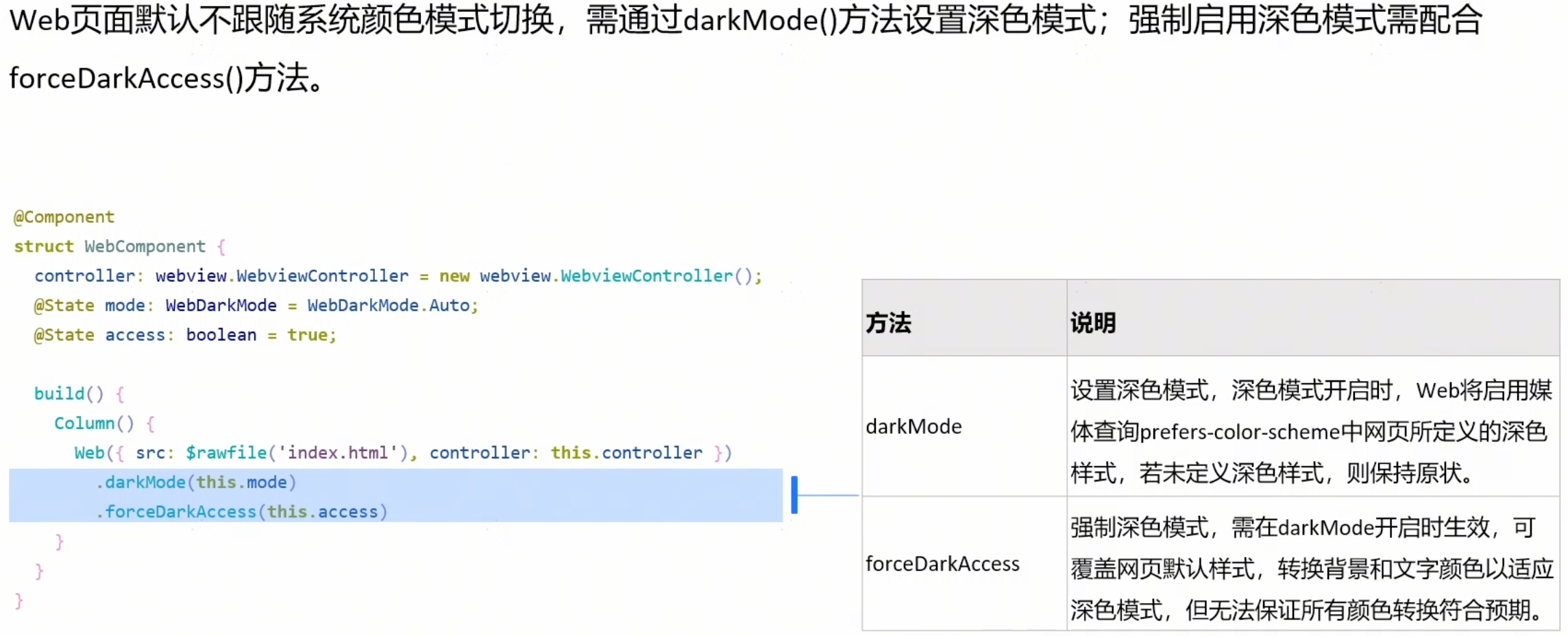 若需要Web页面进行深浅色适配,就需要在Web页面内通过媒体查询的方式单独设置深色模式下的页面样式,并通过Web组件的darkMode()属性来控制Web页面是否启用深色模式。