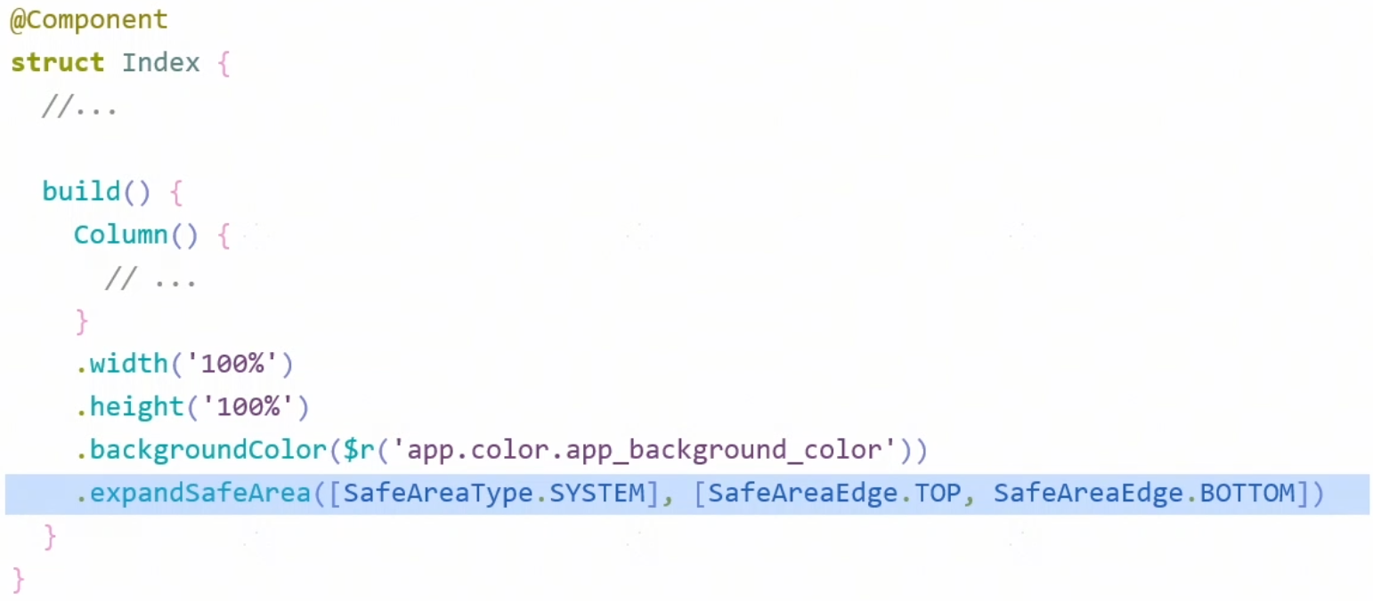 直接给设置背景色的组件添加expandSafeArea属性,使背景色延伸到状态栏和导航条即可。