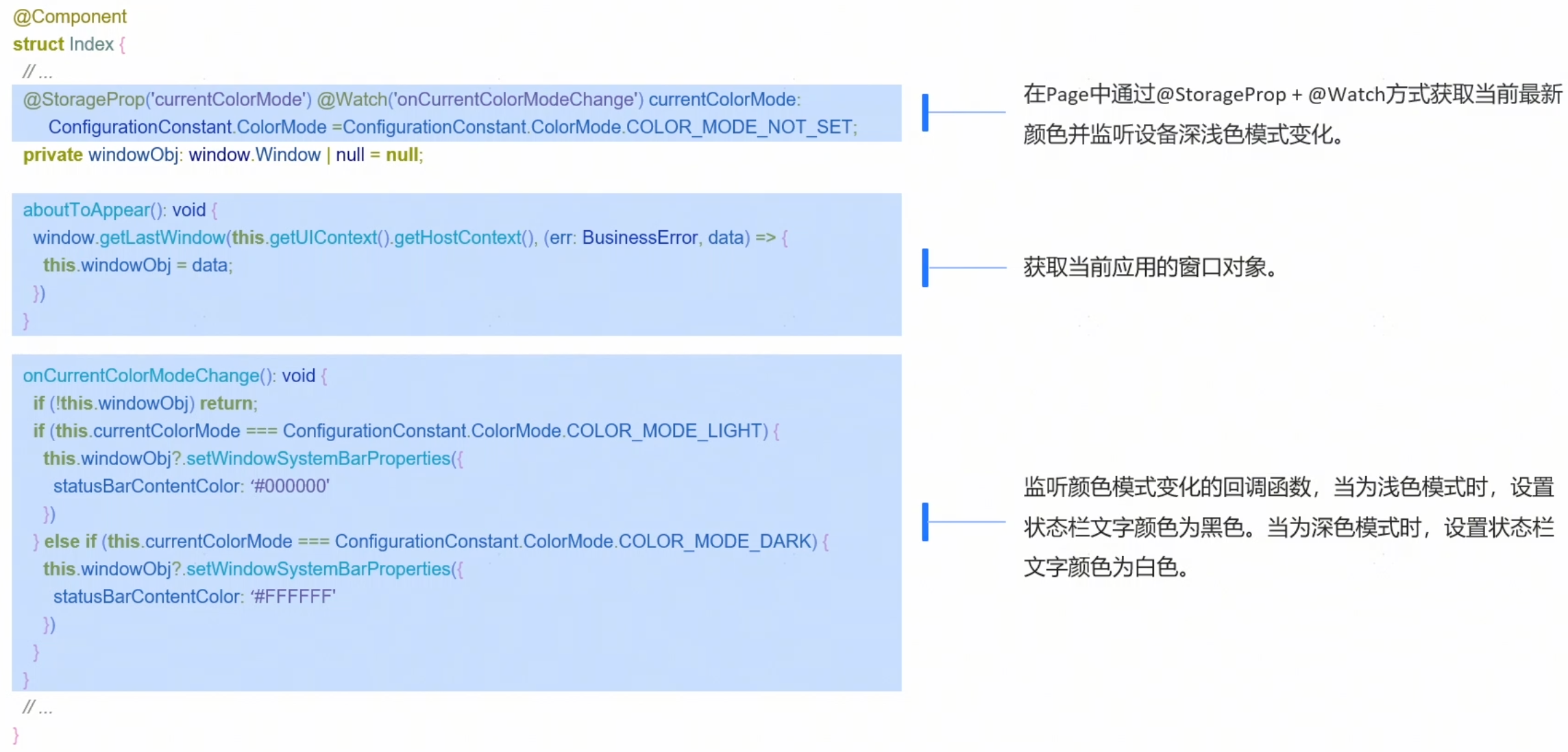 - 在页面内监听深浅色模式状态变量的变化,并根据变化后的深浅色模式来动态设置状态栏文本颜色。