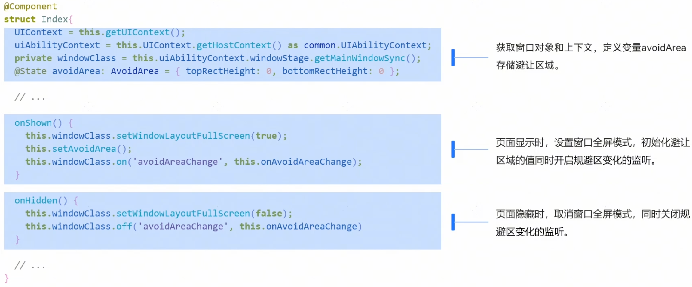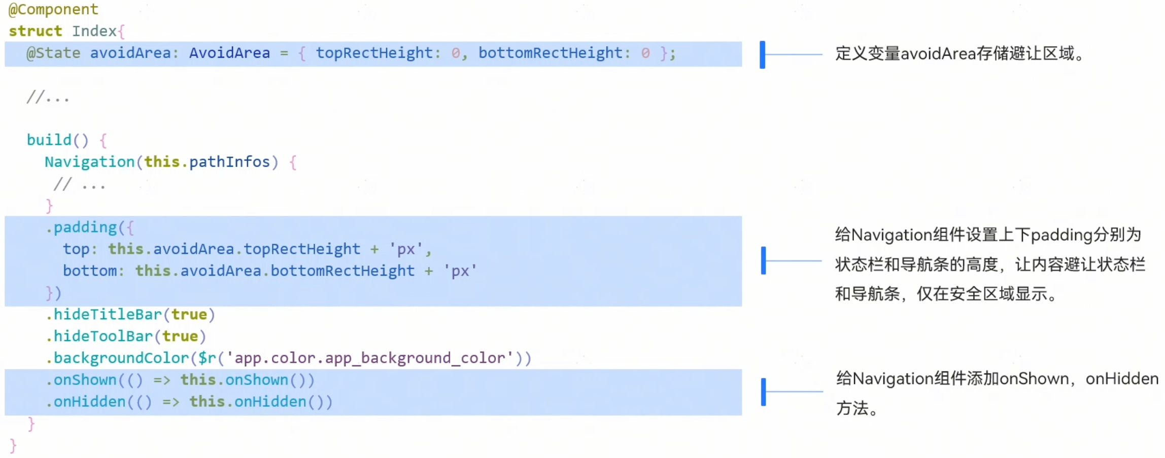 Navigation和Tabs组件从API 11开始默认支持安全区避让特性,即使不设置,也默认会拓展到安全区外。