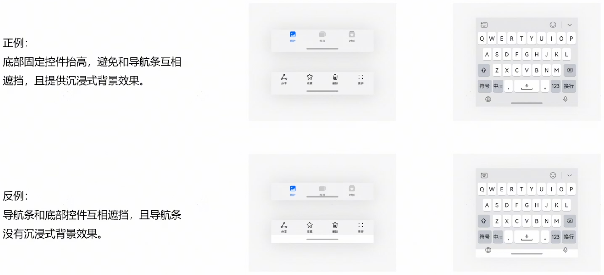 导航条应与页面底部的控件互不干扰,达到和谐的使用体验,同时提供沉浸式背景效果。