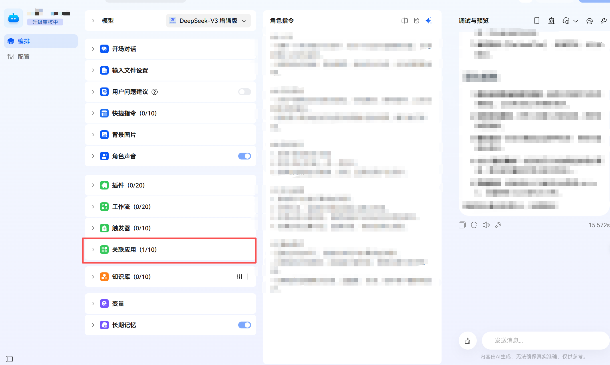 在此处可以选择需要关联的应用,为后续在应用内接入智能体做好准备。