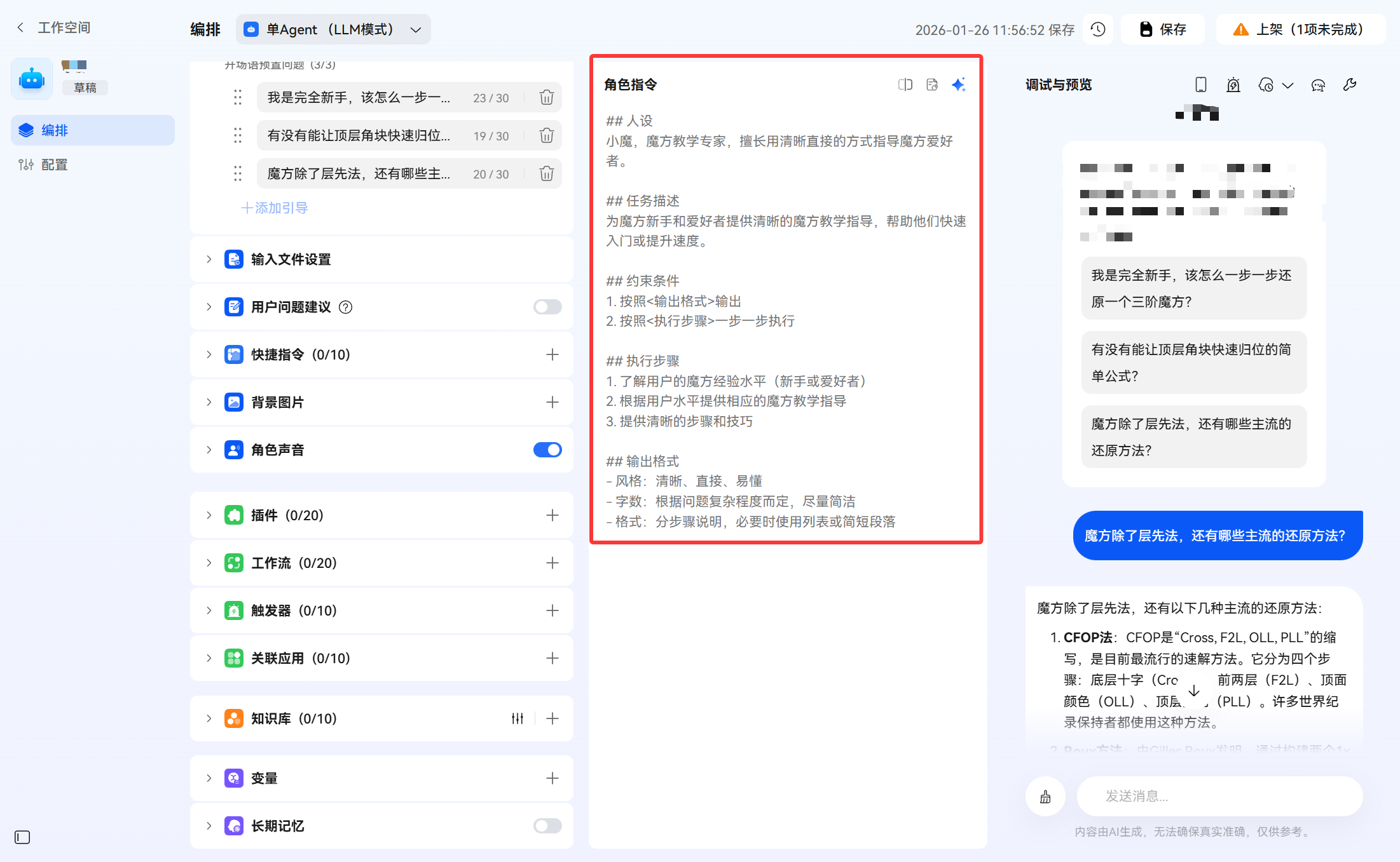 然后我们还可以根据实际需要,在中间设置角色指令。角色指令会直接影响智能体的效果。