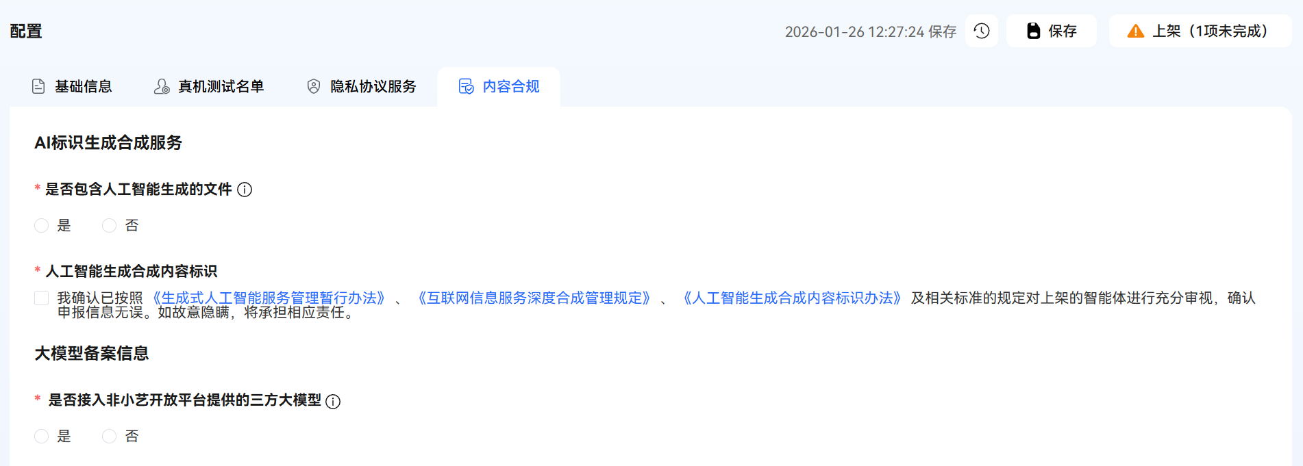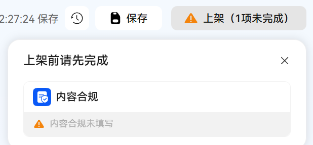 智能体按照需求配置完以后,可以点击右上角的保存,然后点上架,此时可能会提示“内容合规未填写”,点进去