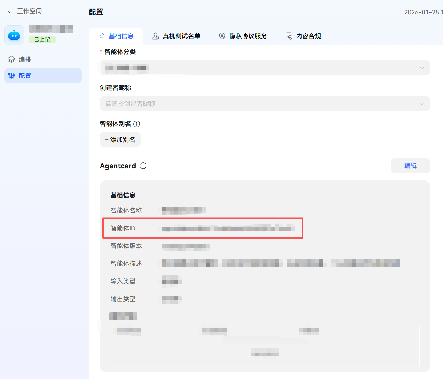 审核通过后,需在智能体详情中获取 agentId,后续开发将用到此 ID。