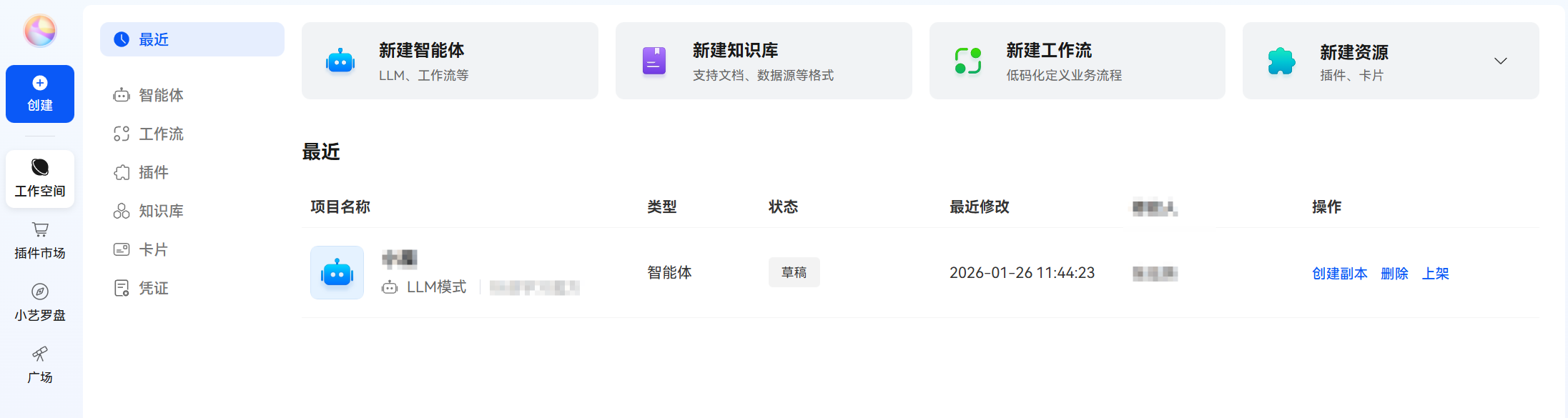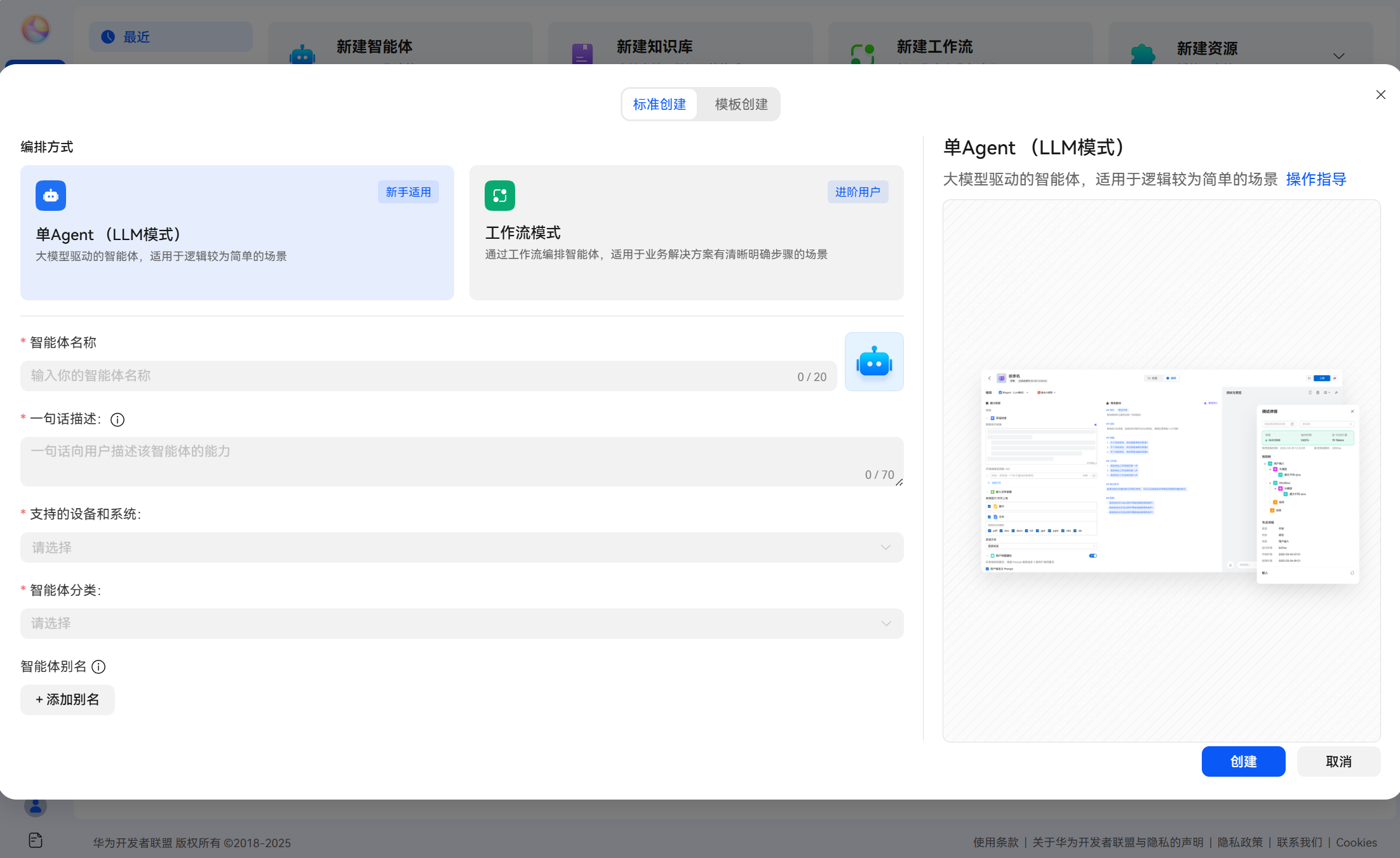 此处以单 Agent(LLM 模式)为例创建智能体。