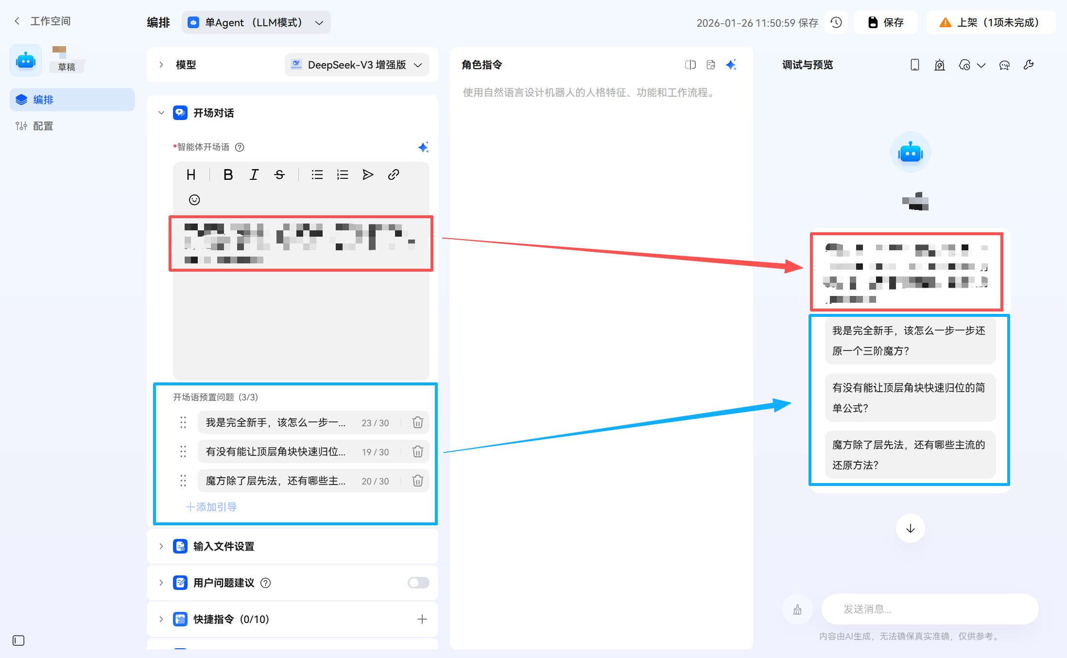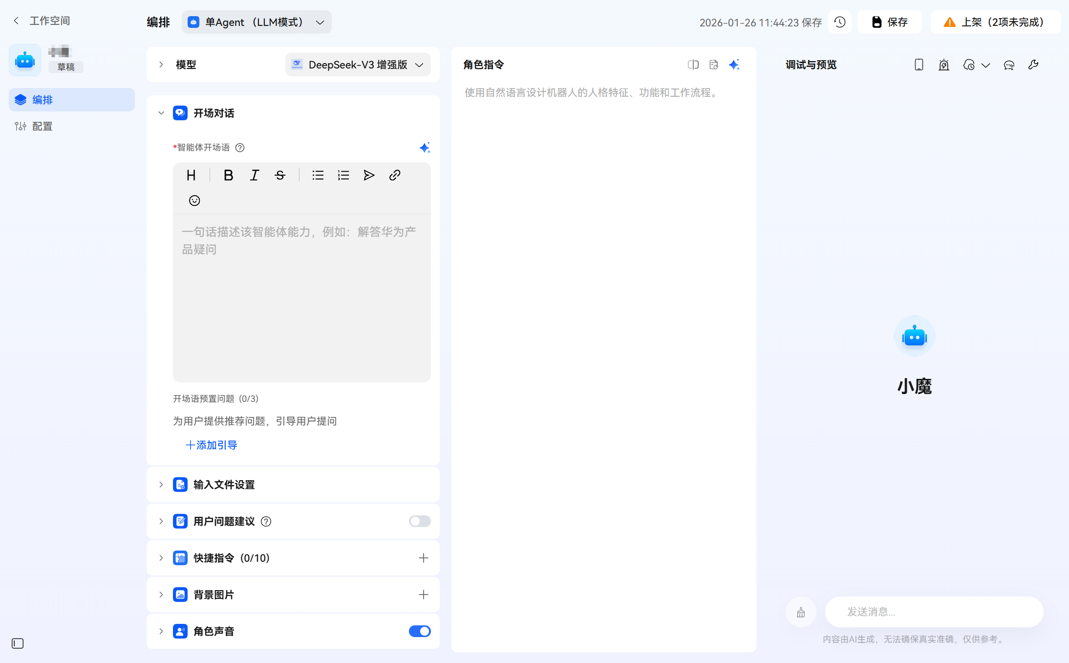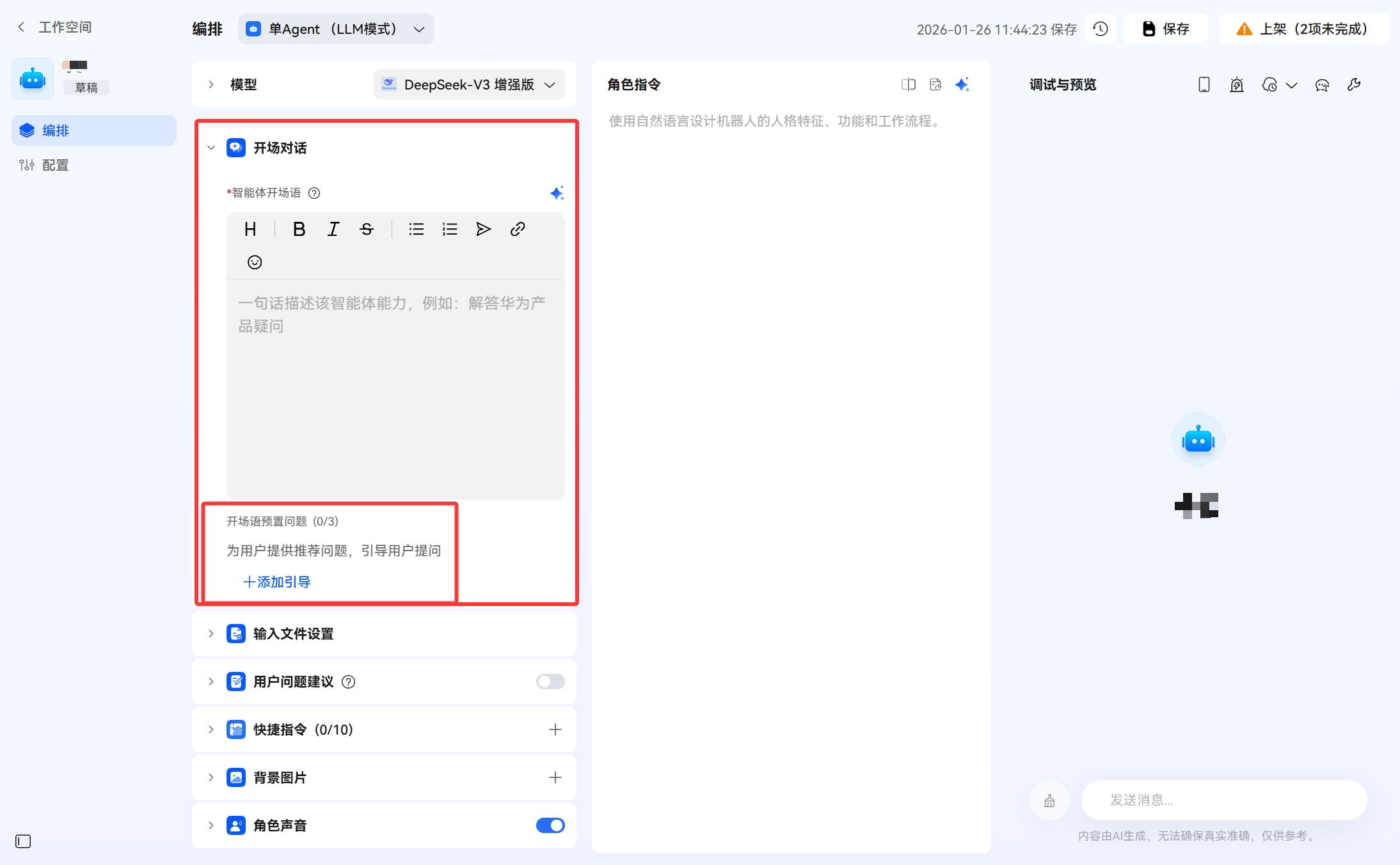 在这里,我们可以设置开场语及预设问题,方便用户更好地上手智能体。
