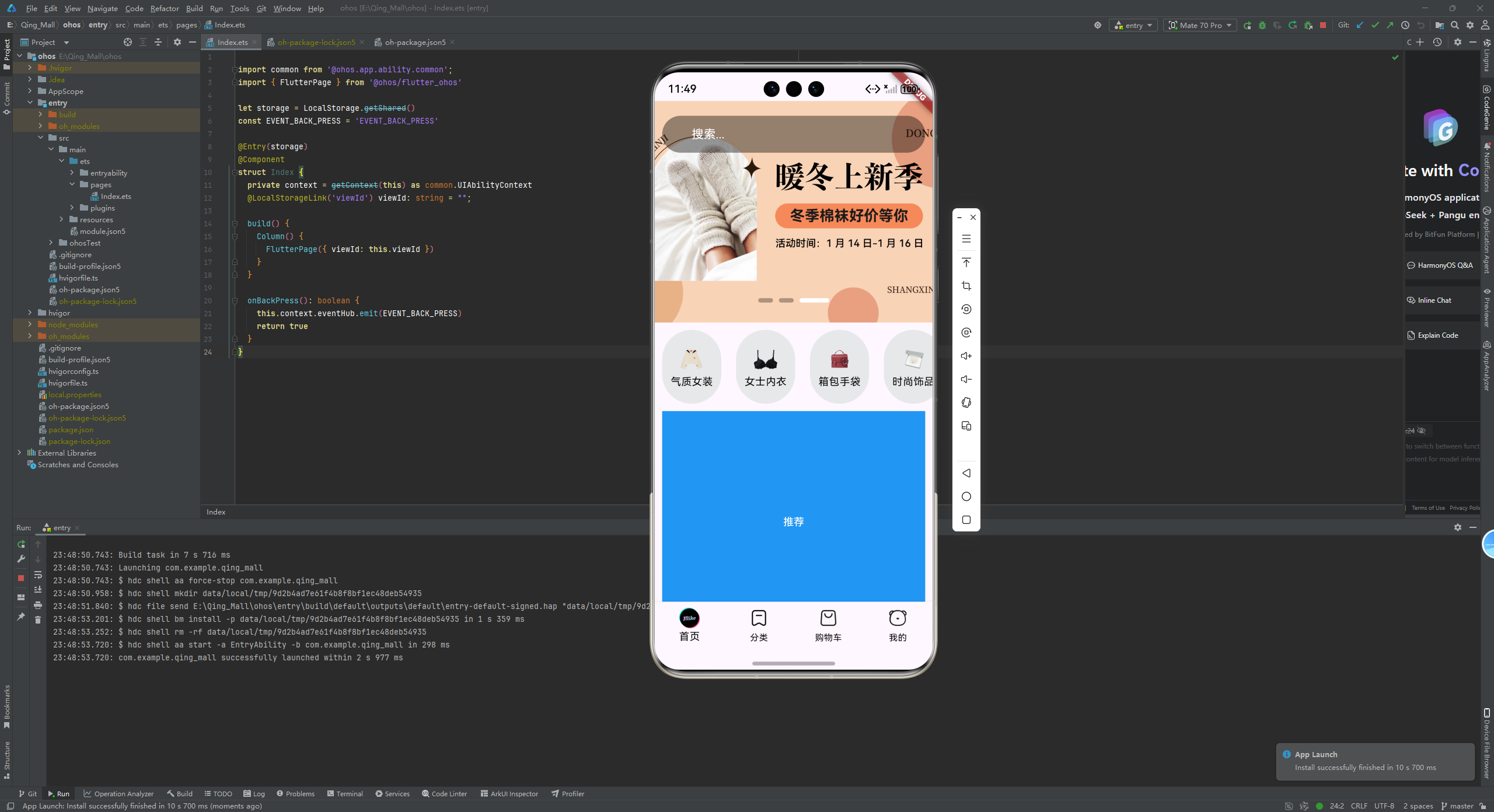 然后运行到鸿蒙模拟器,发现数据虽然出来了,但是UI不太对,所以我们需要手动调整一下代码。
