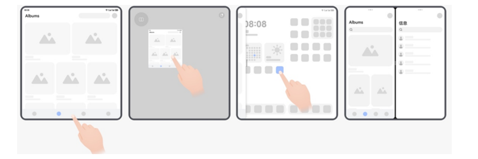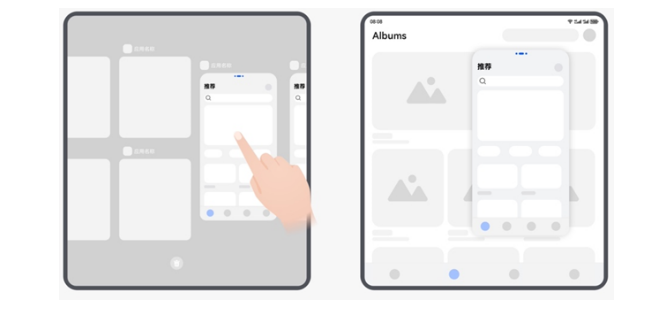 分屏通过手势触发。应用全屏时,从屏幕底部向上滑至左上方热区,进入待分屏状态,单击桌面另一个支持分屏的应用图标或卡片,可形成分屏,如下图所示。