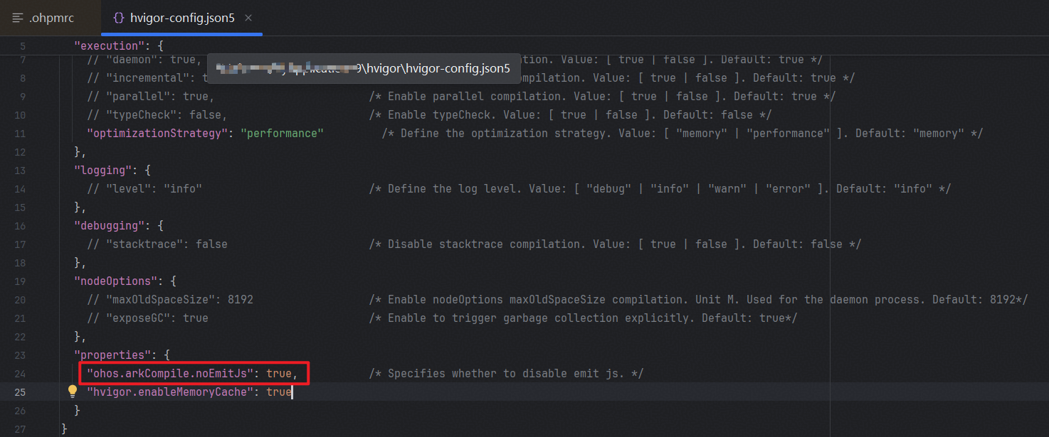 3)平衡编译性能和内存的配置:DevEco Studio提供了内存优先模式和性能优先模式,性能优先模式开启时,启用了任务缓存,编译结束后常驻内存增加。具体可通过hvigor-config.json5 -> properties -> hvigor.enableMemoryCache配置true。将 hvigor-config.json5 -> execution -> optimizationStrategy 设置为"performance"性能优先。开发者可基于实际开发环境灵活选择。