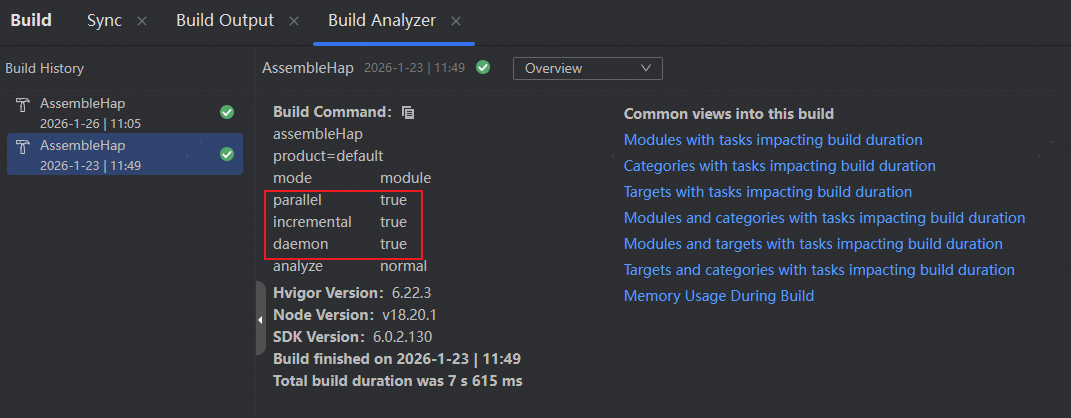 1)默认开启的编译优化配置:DevEco Studio提供了增量构建、并行构建等能力来提升构建效率,减少构建耗时。这些构建配置默认是开启的,开发者可以通过Build Analyzer工具,查看并行(parallel)、增量(incremental)、守护进程(daemon)的开启情况,建议配置为true,以提升构建效率。