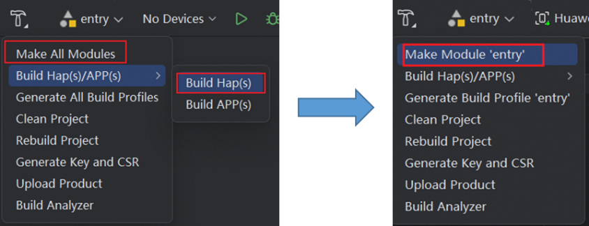 如果需要对某个模块进行开发调试,应避免使用“Make All Modules”,应该使用“Make Module‘***’”,这样避免编译过程中对所有模块启动编译打包任务,进而导致编译耗时变长。当工程下有多个Hap模块(entry或feature),如果只对某一个Hap进行开发调试,也不建议直接使用 “Build Hap(s)”进行构建,这会对所有的Hap模块进行构建,同样会带来较长的编译耗时。这种情况下建议开发者使用“Make Module‘***’”进行构建,仅构建关注的模块,提高开发效率。
