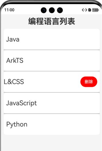 List列表展示所有的编程语言信息,向左滑动使用ListItem的swipeAction方法可显示删除按钮,点击删除,可删除某个编程语言。
