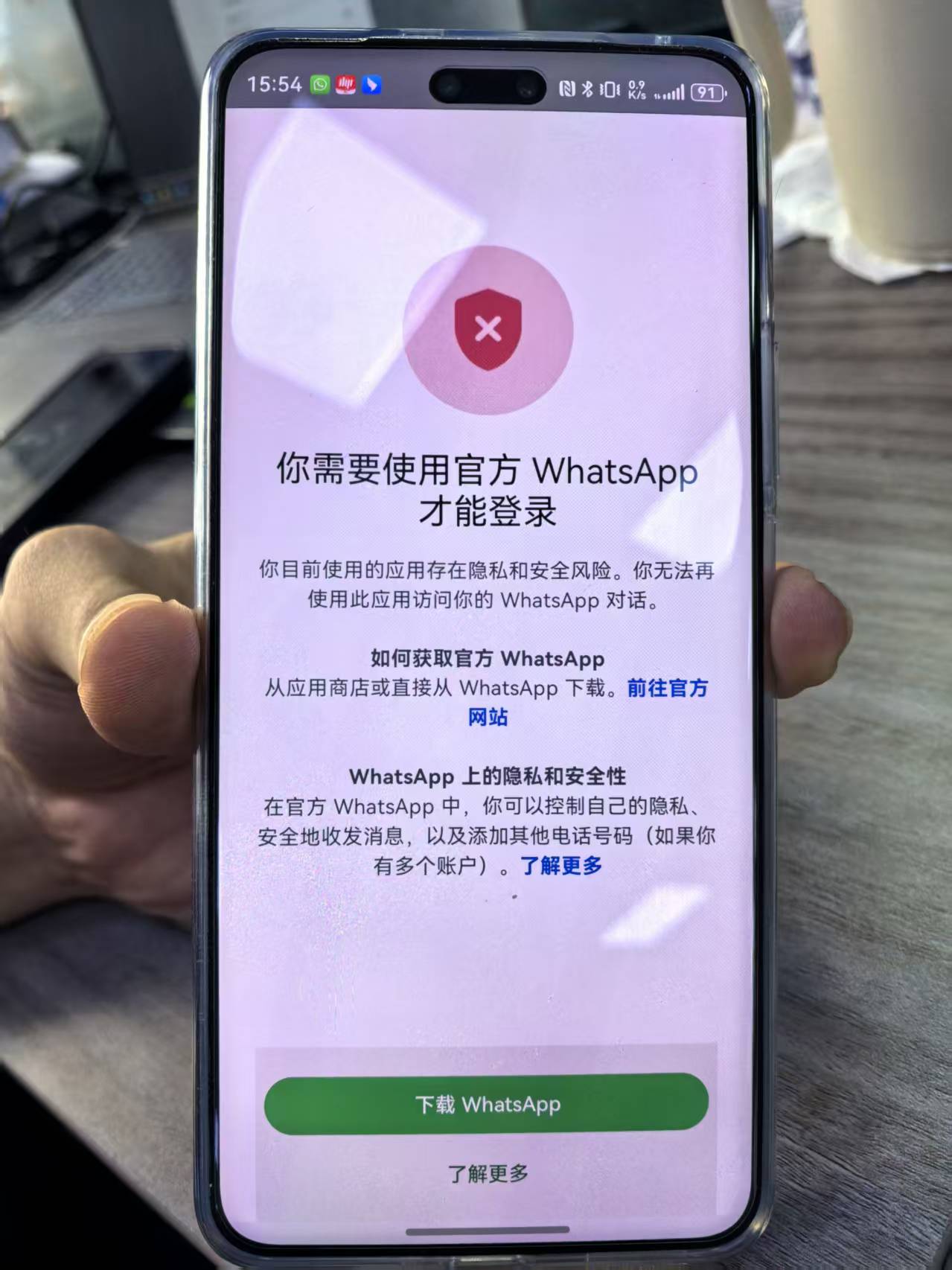 Whatsapp提示需要使用官方WhatsApp才能登录