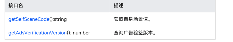 try { const sceneCode: string = sceneManager.getSelfSceneCode(); hilog.info(0, 'TAG', "Succeeded in getting SelfSceneCode res = " + sceneCode); } catch (error) { hilog.error(0, 'TAG', `getSelfSceneCode failed. code is ${error.code}, message is ${error.message}`); }查询广告验签版本
