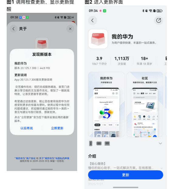 当应用启动完成或用户在应用中主动检查应用新版本时,开发者可以通过本服务,来查询应用是否有可更新的版本。如果存在可更新版本,您可以通过本服务为用户显示更新提醒。